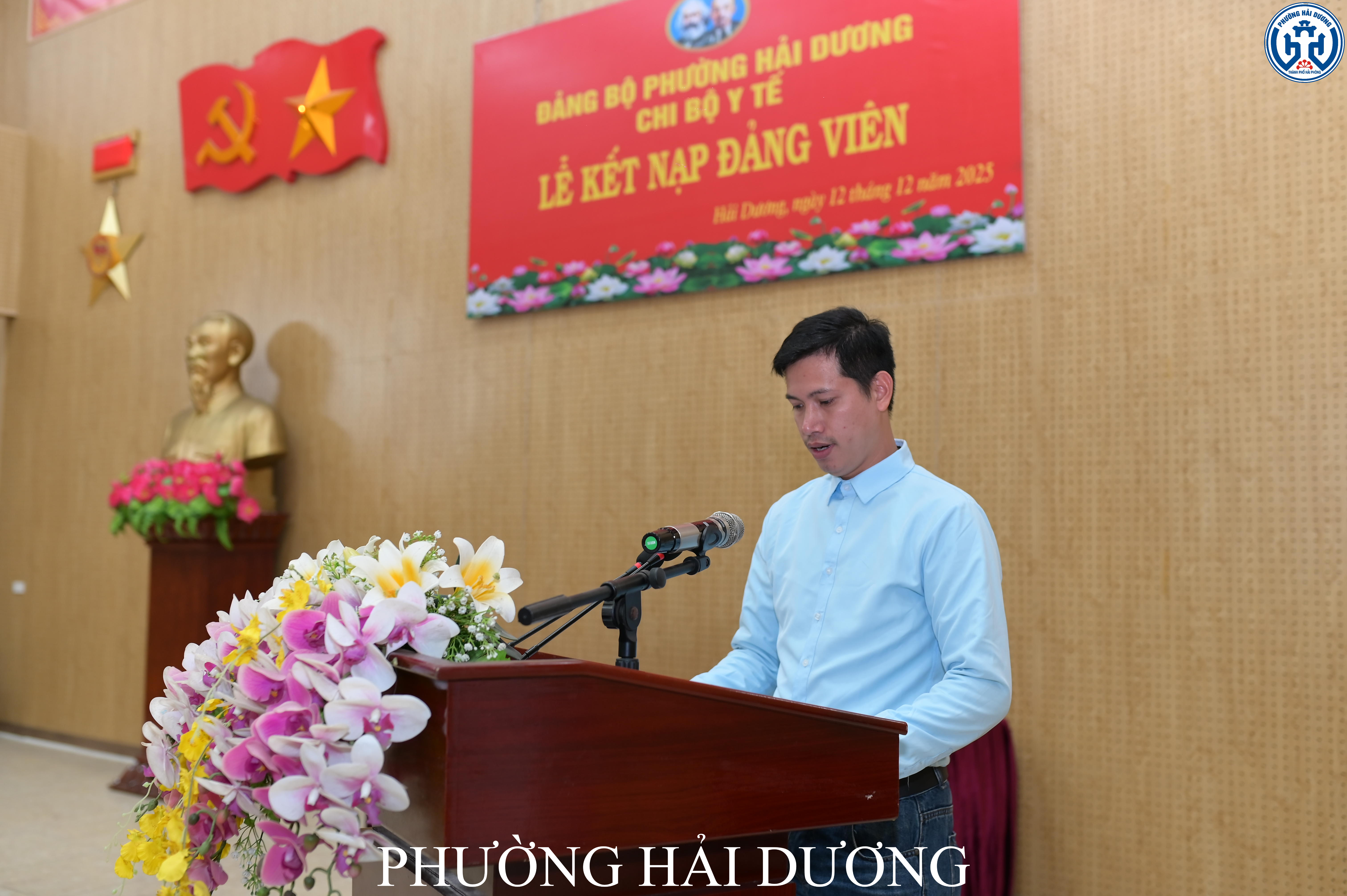 Chiều ngày 12/12, Chi bộ Y tế phường Hải Dương tổ chức Lễ kết nạp Đảng viên cho ba quần chúng ưu tú gồm đồng chí Phan Ngọc Hoài, đồng chí Lê Xuân Đại và đồng chí Lê Thị Huyền. Buổi lễ được tổ chức theo quyết định của Đảng uỷ phường Hải Dương ban hành ngày 02 tháng 12 năm 2025, bảo đảm đầy đủ trình tự, nghi thức theo Điều lệ Đảng Cộng sản Việt Nam.