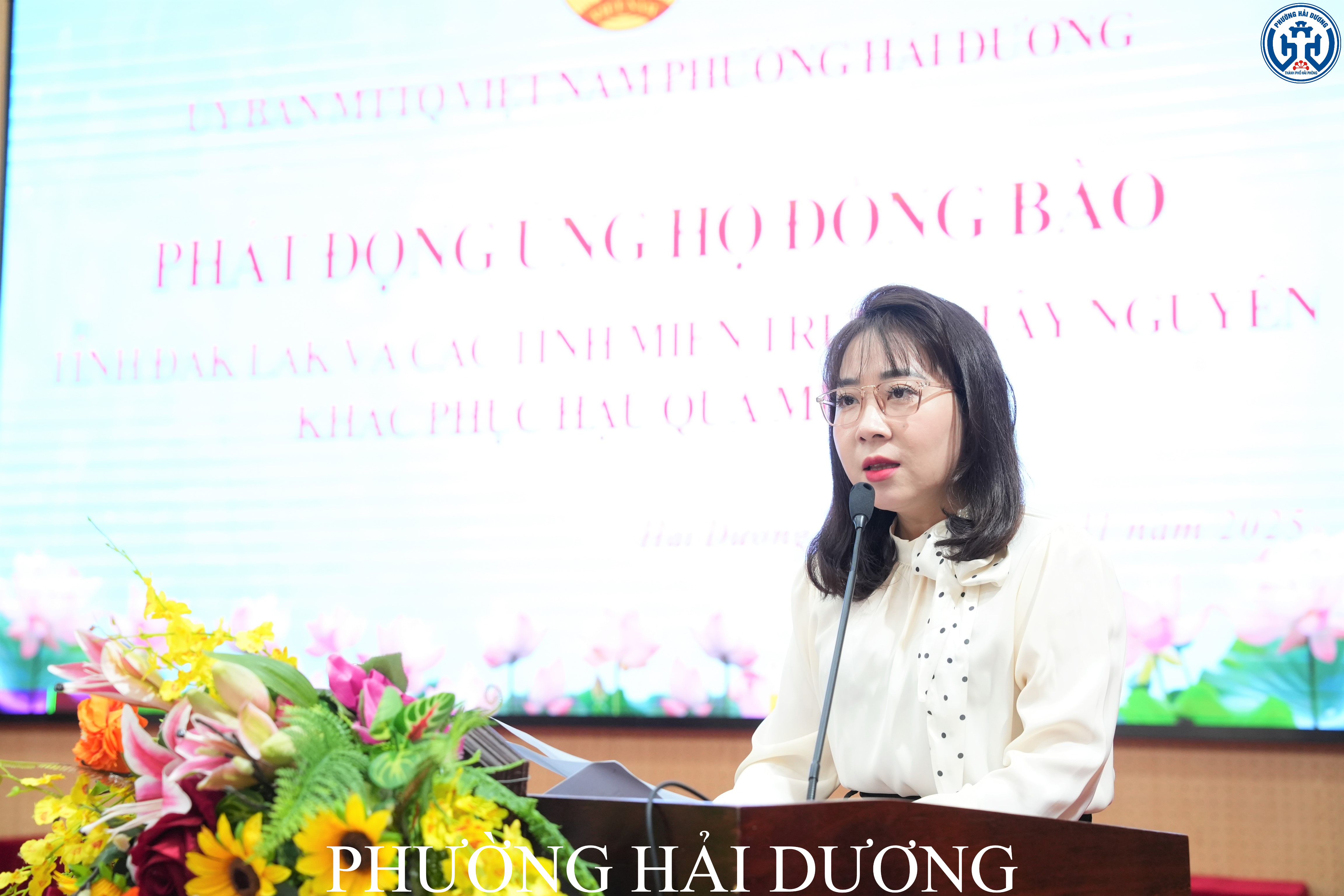 Mở đầu chương trình, hội nghị phát động ủng hộ đồng bào tỉnh Đắk Lắk và các tỉnh miền Trung – Tây Nguyên khắc phục hậu quả mưa lũ. Cán bộ, đảng viên tham dự đã tích cực hưởng ứng, thể hiện tinh thần tương thân tương ái, chung tay sẻ chia khó khăn với Nhân dân vùng thiên tai, qua đó lan tỏa truyền thống đoàn kết, nghĩa tình của Đảng bộ và Nhân dân phường Hải Dương.