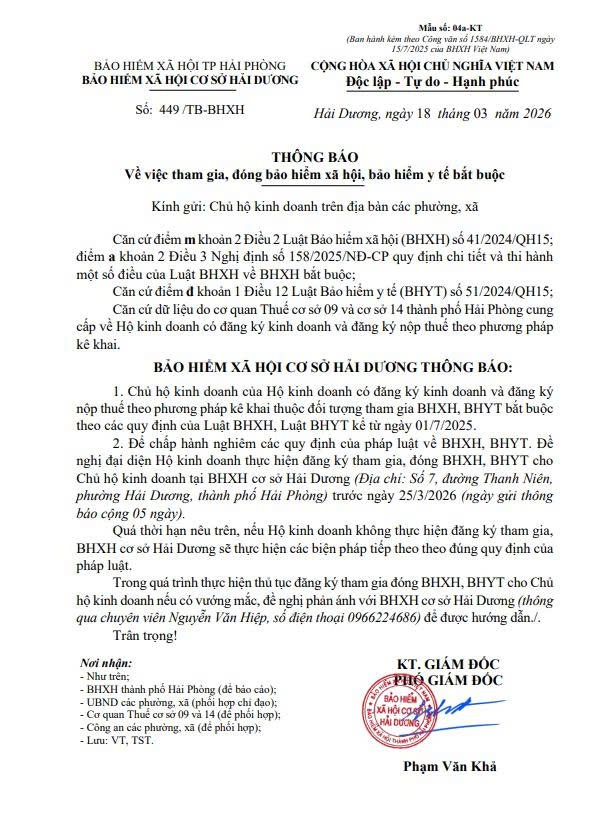 Thông báo số 449/TB-BHXH ngày 18/3/2026 của Bảo hiểm xã hội về việc tham gia, đóng bảo hiểm xã hội, bảo hiểm y tế bắt buộc