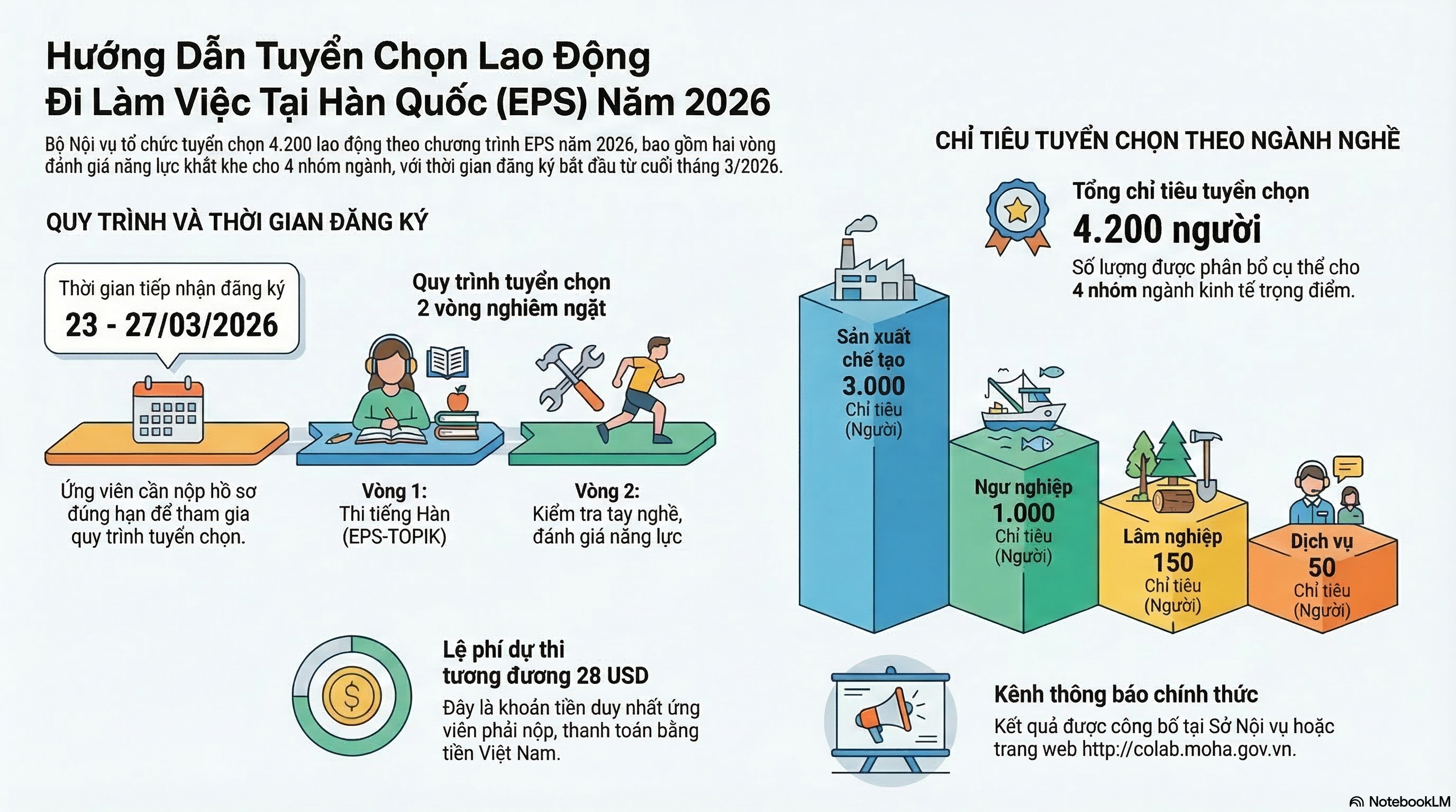 Bộ Nội vụ sẽ tổ chức kỳ thi tiếng Hàn và kiểm tra tay nghề năm 2026 cho người lao động có nguyện vọng đi làm việc tại Hàn Quốc theo Chương trình EPS. Đây là hoạt động triển khai thực hiện Bản ghi nhớ giữa Bộ Việc làm và Lao động Hàn Quốc và Bộ Nội vụ Việt Nam về việc phái cử và tiếp nhận người lao động Việt Nam sang làm việc tại Hàn Quốc theo chương trình EPS.