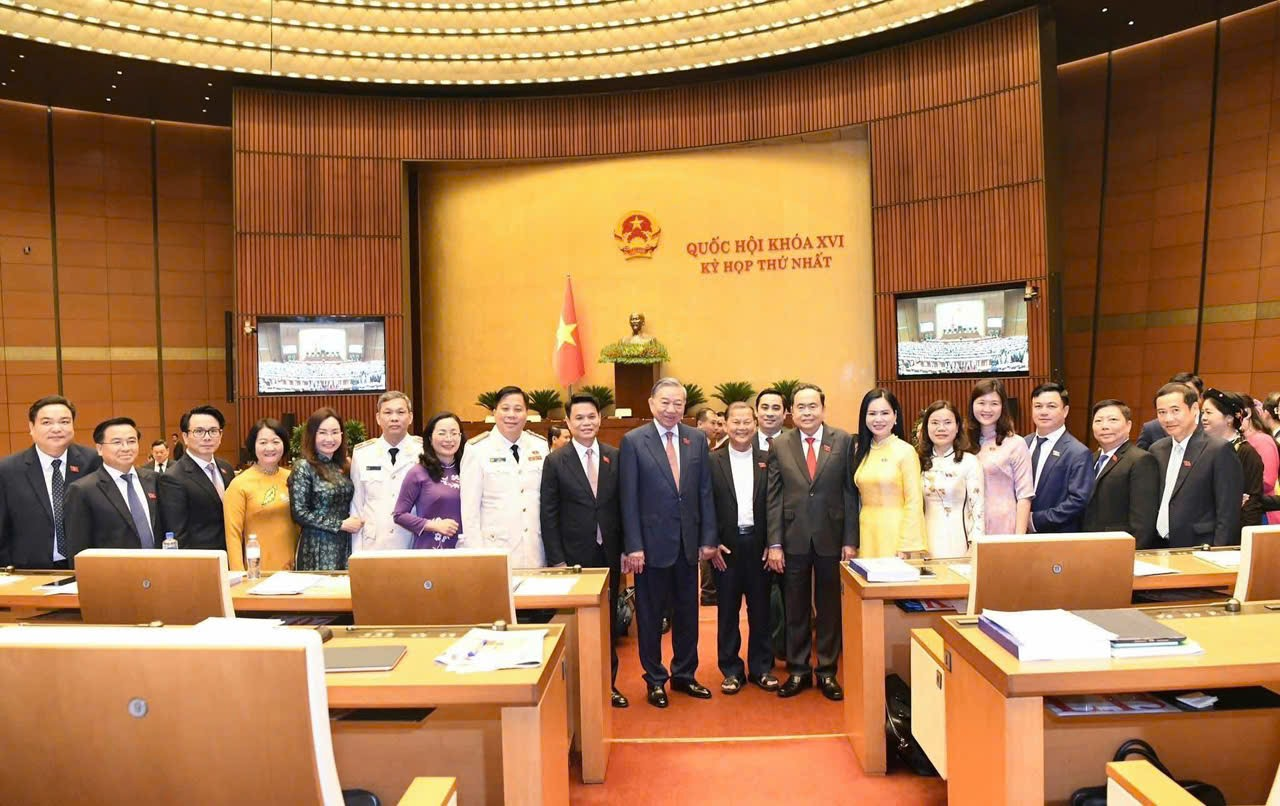 Đoàn Đại biểu Quốc hội Hải Phòng chụp ảnh lưu niệm với đồng chí Tổng Bí thư Tô Lâm và đồng chí Chủ tịch Quốc hội Trần Thanh Mẫn, ngày 6/4/2026.